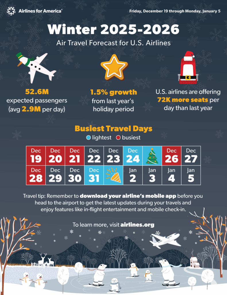 Airlines for America (A4A) is projecting that U.S. airlines will transport nearly 53 million passengers over the winter holiday travel period (December 19–January 5), up 1.5 percent from the same time last year.